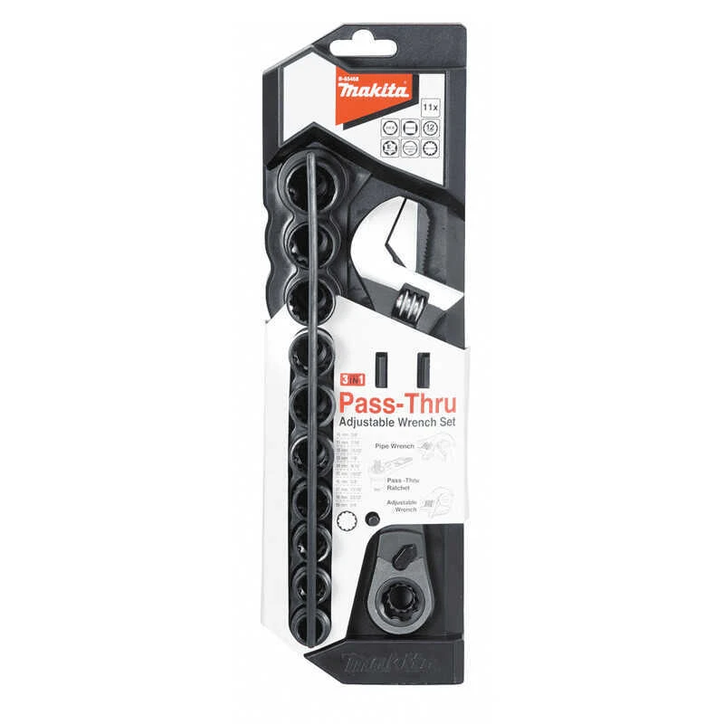 La clé à molette multifonction MAKITA B-65458 fais office de couteau suisse dans votre boite à outils. Son mors réversible permet de serrer des tuyaux, des écrous et boulons mêmes abimés. Elle permet aussi d’être utilisée comme clé à cliquet grâce à son jeu de 10 douilles à 12 points de 10 mm à 19 mm.