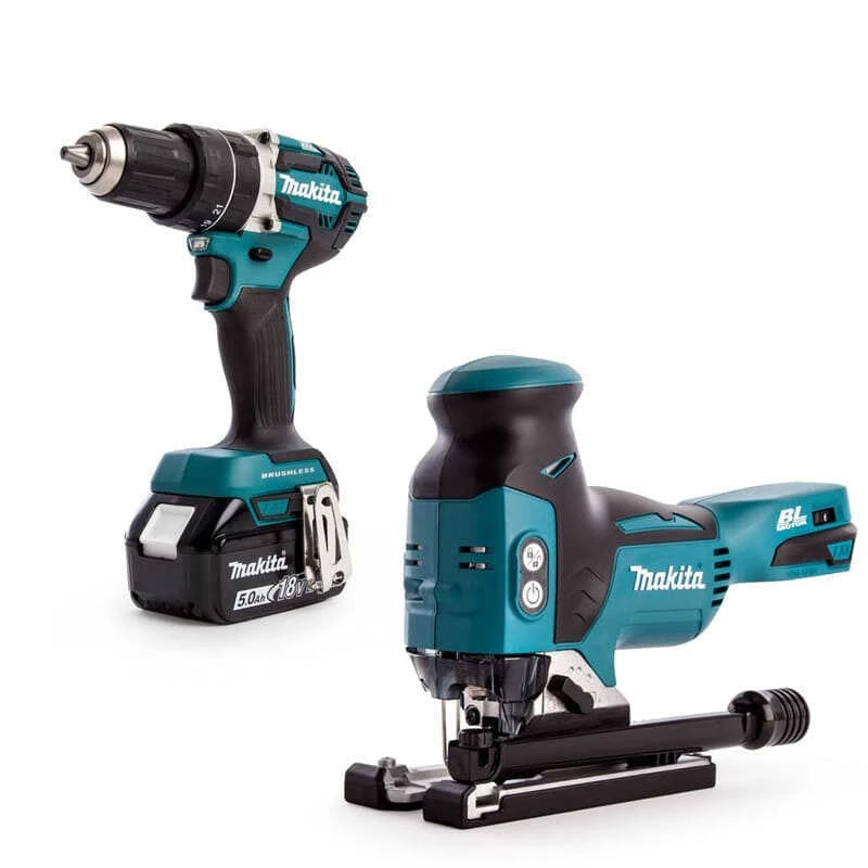 Pack de deux outils sans fil gamme LXT 18 V, l’un pour la découpe de panneaux en bois, et l’autre pour le perçage. Ces deux outils sans fil de la gamme LXT 18V Makita sont équipés d’un moteur Brushless sans charbon.
