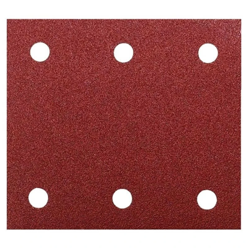 Papier abrasif rectangulaire avec bande auto agrippante avec six trous pour une meilleure évacuation de la poussière.