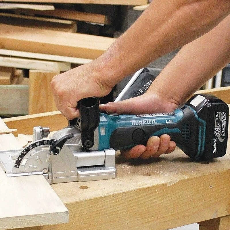La fraiseuse à batterie LXT 18V Makita DPJ180Z possède une semelle inclinable à levier de verrouillage rapide et arrêts automatiques à 0°, 45° et 90°. Par ailleurs, la distance entre le centre de la rainure et la semelle ou la butée à été pensée pour assembler les matériaux d’épaisseurs courantes (18-22 mm) sans la moindre réglage de la part de l’utilisateur afin d’économiser du temps et de l’énergie.