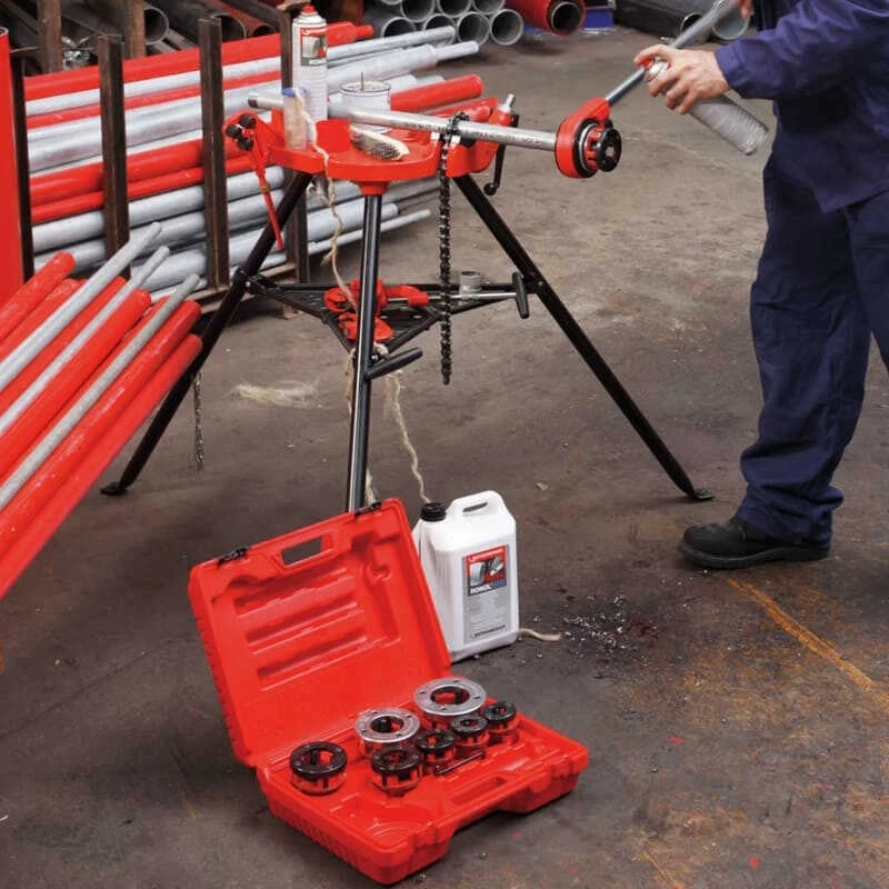 Le kit SUPER BSPT R est conçu pour une utilisation facile et efficace. Les filières et les matériels de coupe sont interchangeables et peuvent être rapidement fixés au support, ce qui permet un travail rapide et précis. Le kit est également facile à transporter grâce à son boîtier de rangement pratique et résistant.