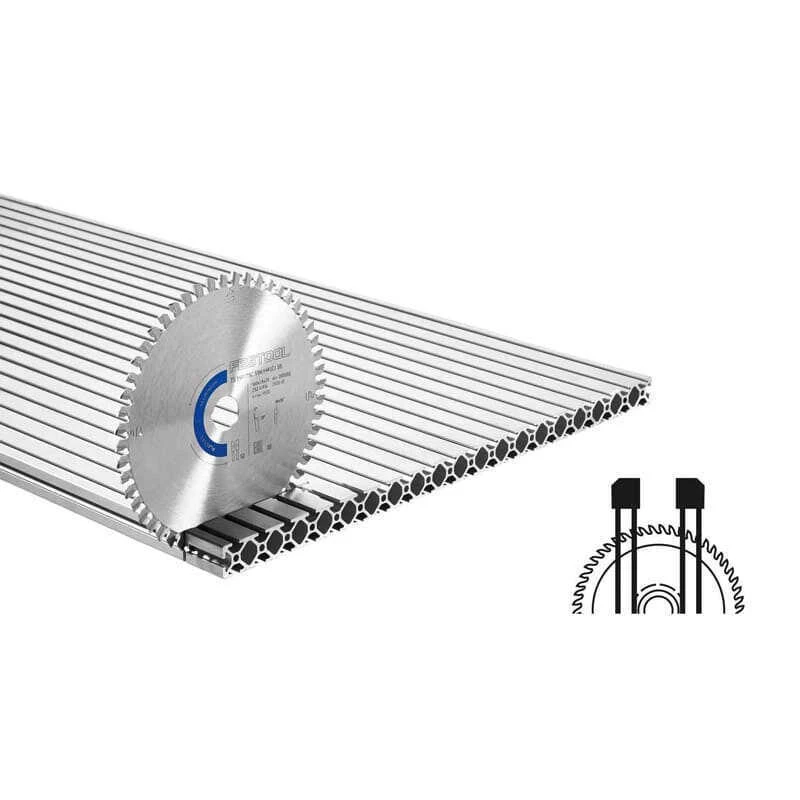 Lame de scie circulaire à denture plate trapézoïdale garnie de carbure à grains ultrafins, pour une résistance et une durée de vie maximales. Idéale pour les panneaux et profilés d’aluminium ainsi que les matières plastiques.