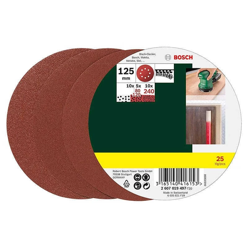 Découvrez le lot de 25 disques abrasifs Ø125 mm mm perforés Bosch ! Avec lui pas besoin de plus, les différents grains vous permettrons de travailler de A à Z, du dégrossissement à la finition.