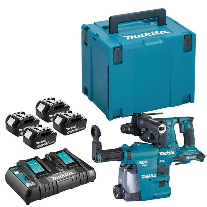 Perforateur burineur Makita avec filtre HEPA DX09 et 4 batteries 5,0 Ah – DHR281PT4WJ
