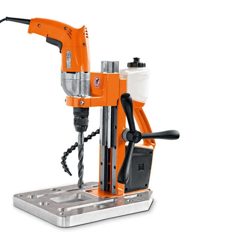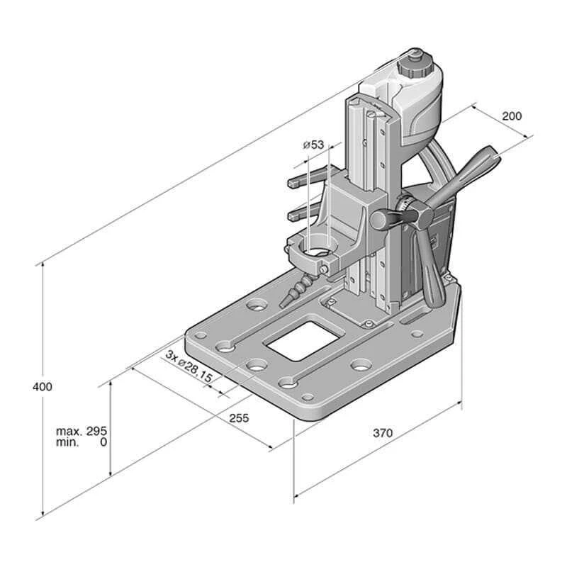 Support de perçage industriel compact et léger avec plaque de base en aluminium, adapté pour une utilisation universelle : perçage, taraudage, alésage et chanfreinage par exemple. Double guidage de la perceuse portative pour l’utilisation d’outils de perçage de grande longueur. Plaque de base avec gabarit de perçage pour tables de soudage Demmeler et Siegmund Système 28. Réservoir pour lubrifiant intégré avec flexible de lubrification. Volant d’avance réversible droite/gauche. Hauteur du coulisseau réglable sans outil.